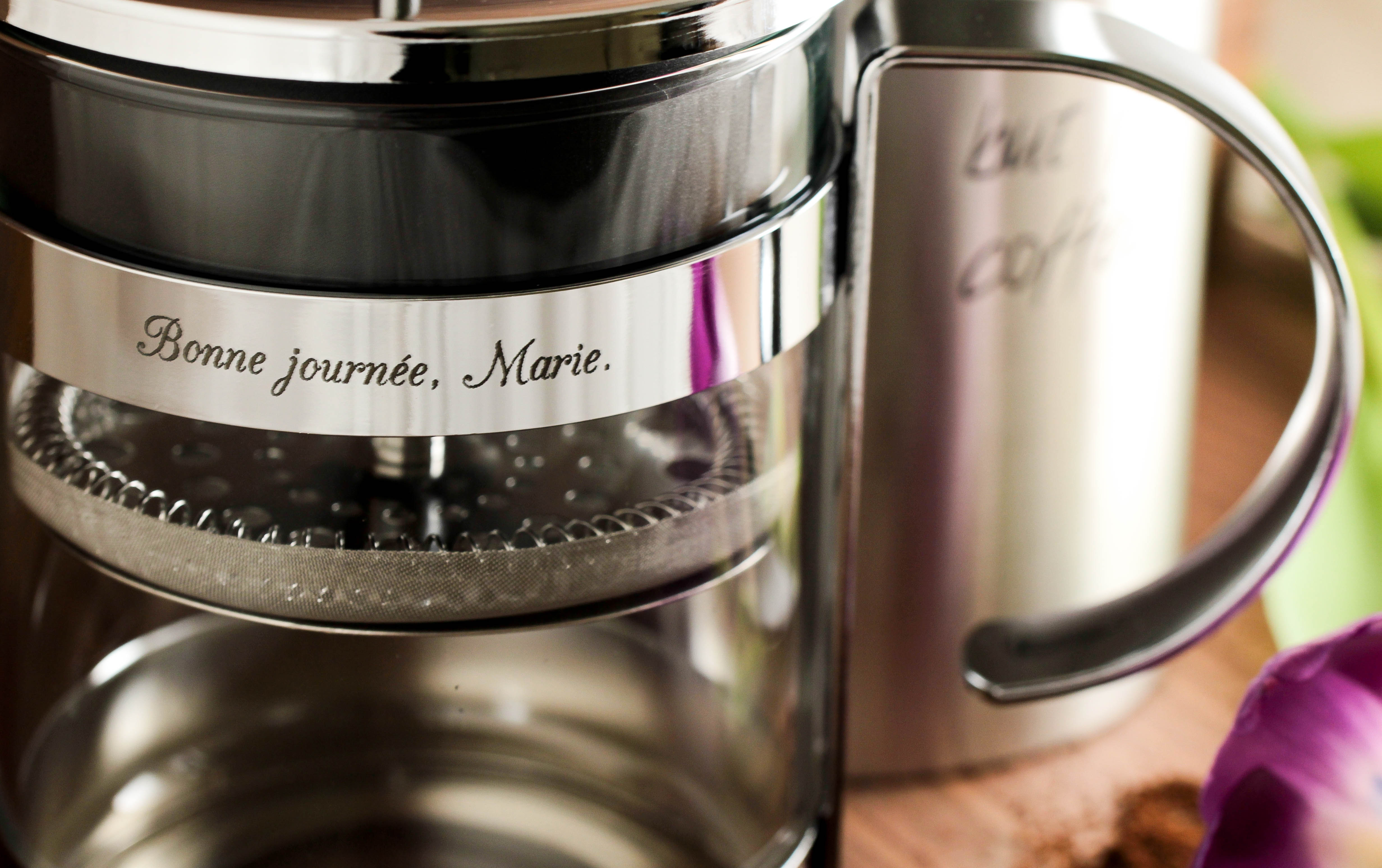 Bonjour French Press Luxe mit Gravur! Na, gut geschlafen? Kaffeepresse, Pressstempelkanne, Kaffeedrücker oder Cafetière: Die Namen für den manuellen Kaffeezubereiter sind zahlreich, das Prinzip aber ganz einfach erklärt: Nachdem der gemahlene Kaffee die gewünschte Ziehzeit erreicht hat, wird das Kaffeepulver durch das Sieb auf den Boden gedrückt, sodass der gefilterte Kaffee genossen werden kann.