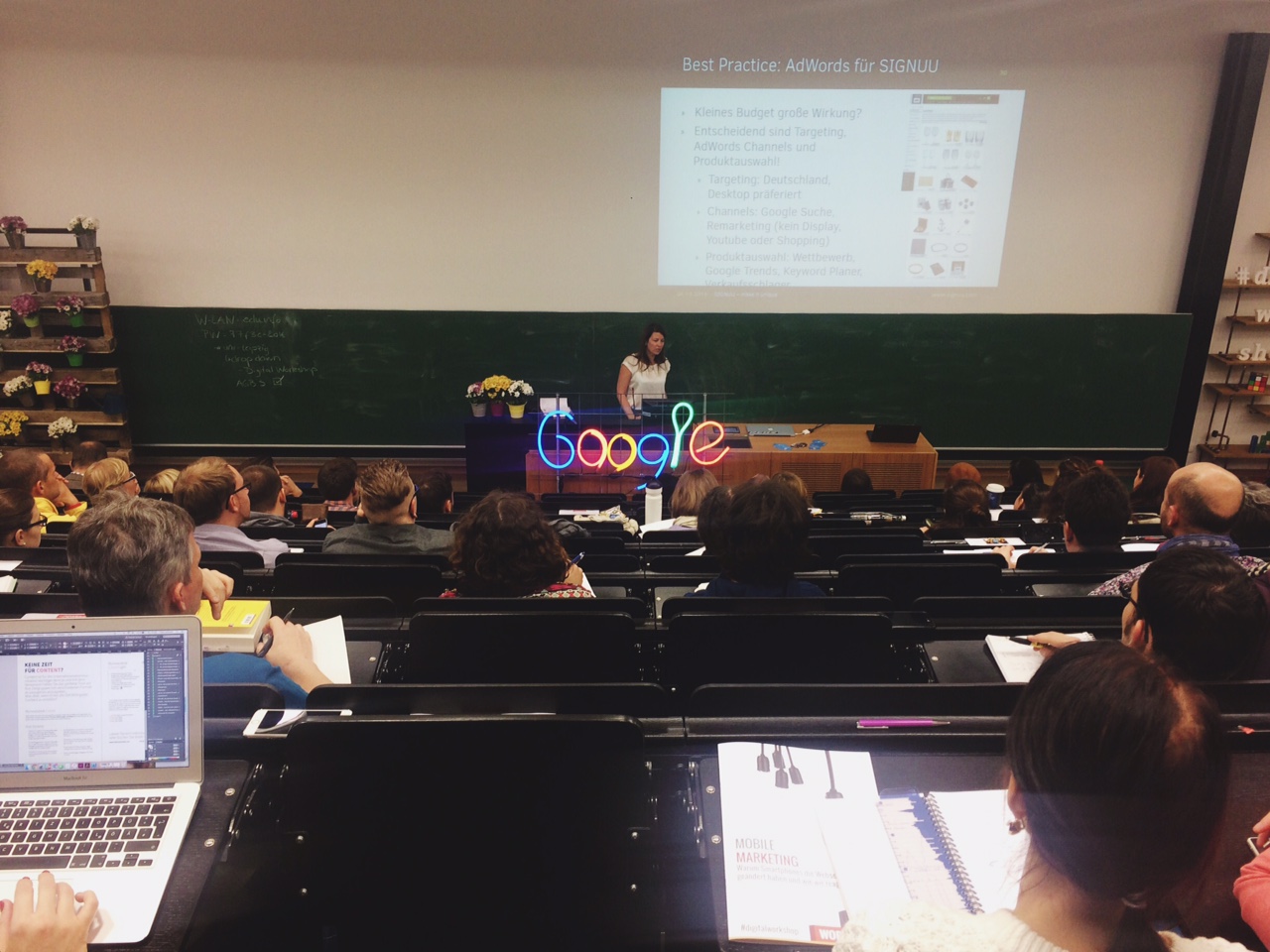 In jeweils halbstündigen Vorträgen haben wir zu den „Google Digital Workshops On Campus“ einen Einblick in digitale Strategien und Trends, Online-Marketing mit kleinen Budgets und Pay-Per-Click Werbung mit AdWords bei SIGNUU gegeben. Professionelle Unterstützung haben wir dabei von Sandy von der Online-Marketing, Print & Design- Agentur „klickkomplizen“ bekommen. Die Ausrichtung nach diesen spannenden Vorträgen ist klar: Effektive Social Media-Kanäle, ansprechende Displaywerbung, optimierte Work-Flows, Web-Analystics, Best Practices und ein ansprechendes Design werden immer wichtiger. Bereit für die Zukunft? YES!