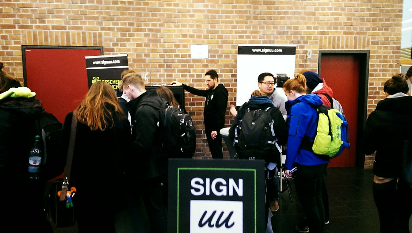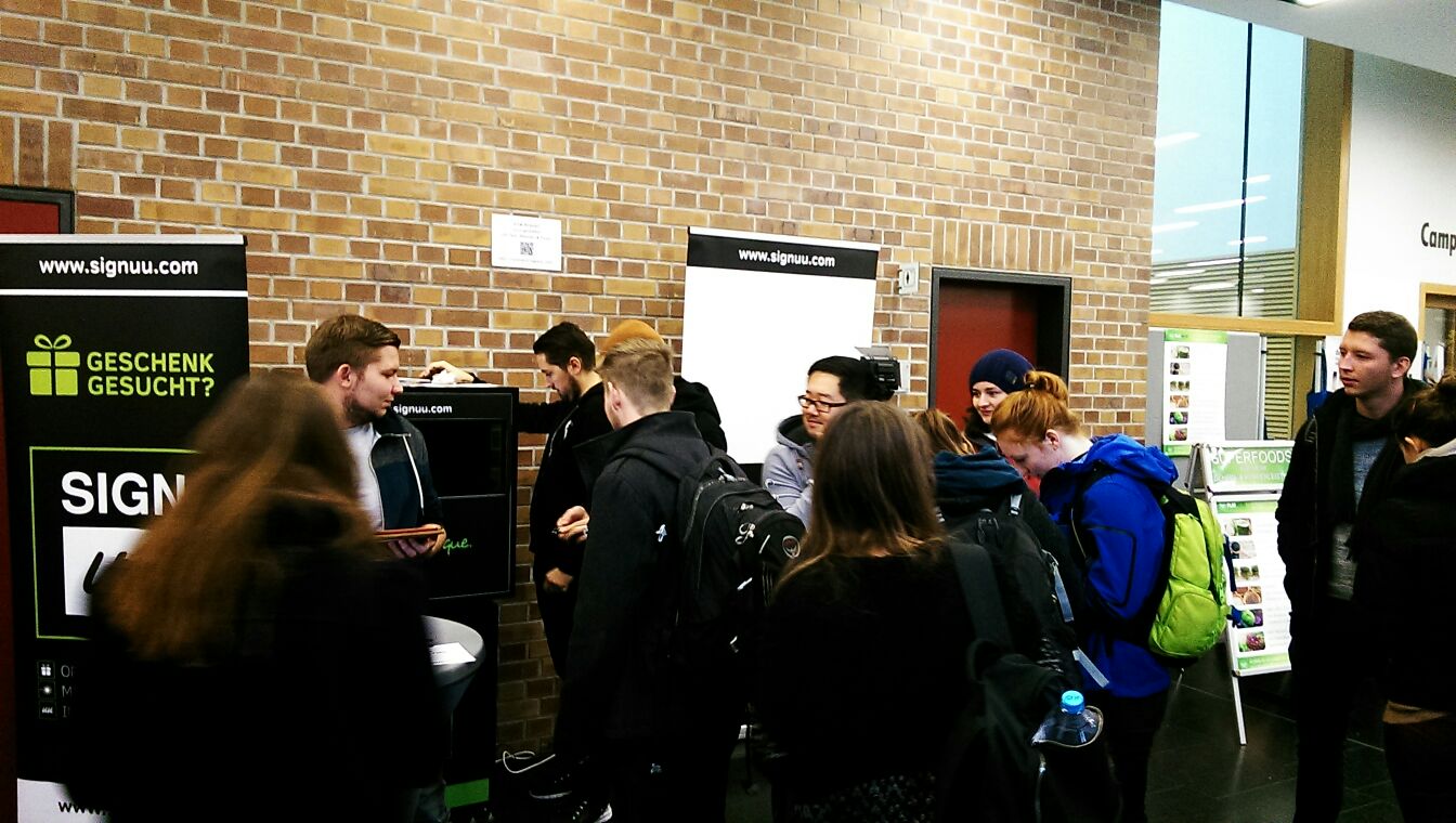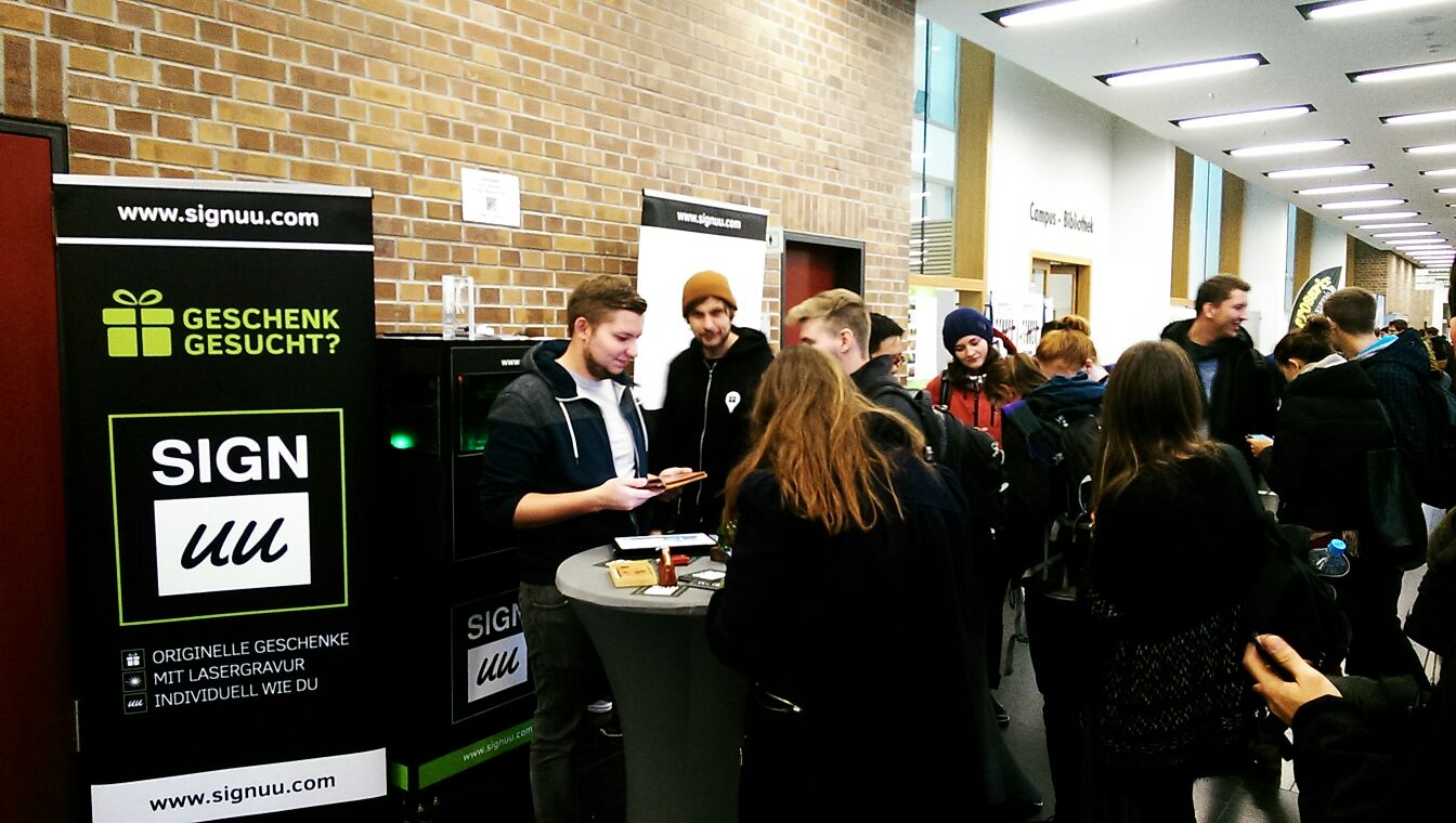 Egal, ob mit oder ohne Mittagshunger: Die interessierten Studenten stürmten die Stände der Jungunternehmer. Freibier, Informationen zu spannenden Projekten, neue Schmuckstücke zum Anfassen und individuelle Schlüsselanhänger zum Mitnehmen. Unser SIGNUU ONEVENT-Team war wieder voller Elan im Einsatz. Innerhalb von vier Stunden haben wir mit dem mobilen Laser zahlreiche Gestaltungen designt und Fotos, Texte und Motive auf die Edelstahlanhänger graviert. Glückliche Gesichter, proppevolle Gänge, gute Gespräche und beste Laune inklusive!