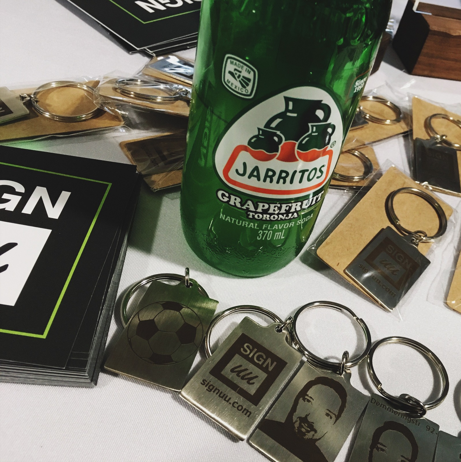 Wir erklären es dir: Das frisch geschossene Foto mit dem iPad wird sofort auf die OnEvent-SIGNUU Homepage hochgeladen und kann dann über den Konfigurator bearbeitet werden. Schnell noch einen Text hinzufügen und schon können die Daten an den Laser abgeschickt werden. Nur wenige Sekunden später liegt der Anhänger mit Gravur in der Hand. „So schnell geht das?“ – genau! Wie der gesamte Prozess abläuft, kannst du dir auf unserer Gravur Event-Seite anschauen. Egal, ob zu dritt, zu fünft oder auch allein auf dem Foto, wir konnten mit einem Schlüsselanhänger aus Edelstahl alle Gäste glücklich machen. Was uns den Abend zusätzlich versüßt hat, war die Entdeckung der „Jarritos“ Kult-Limonade aus Mexiko am Nachbarstand. So gefällt uns das!